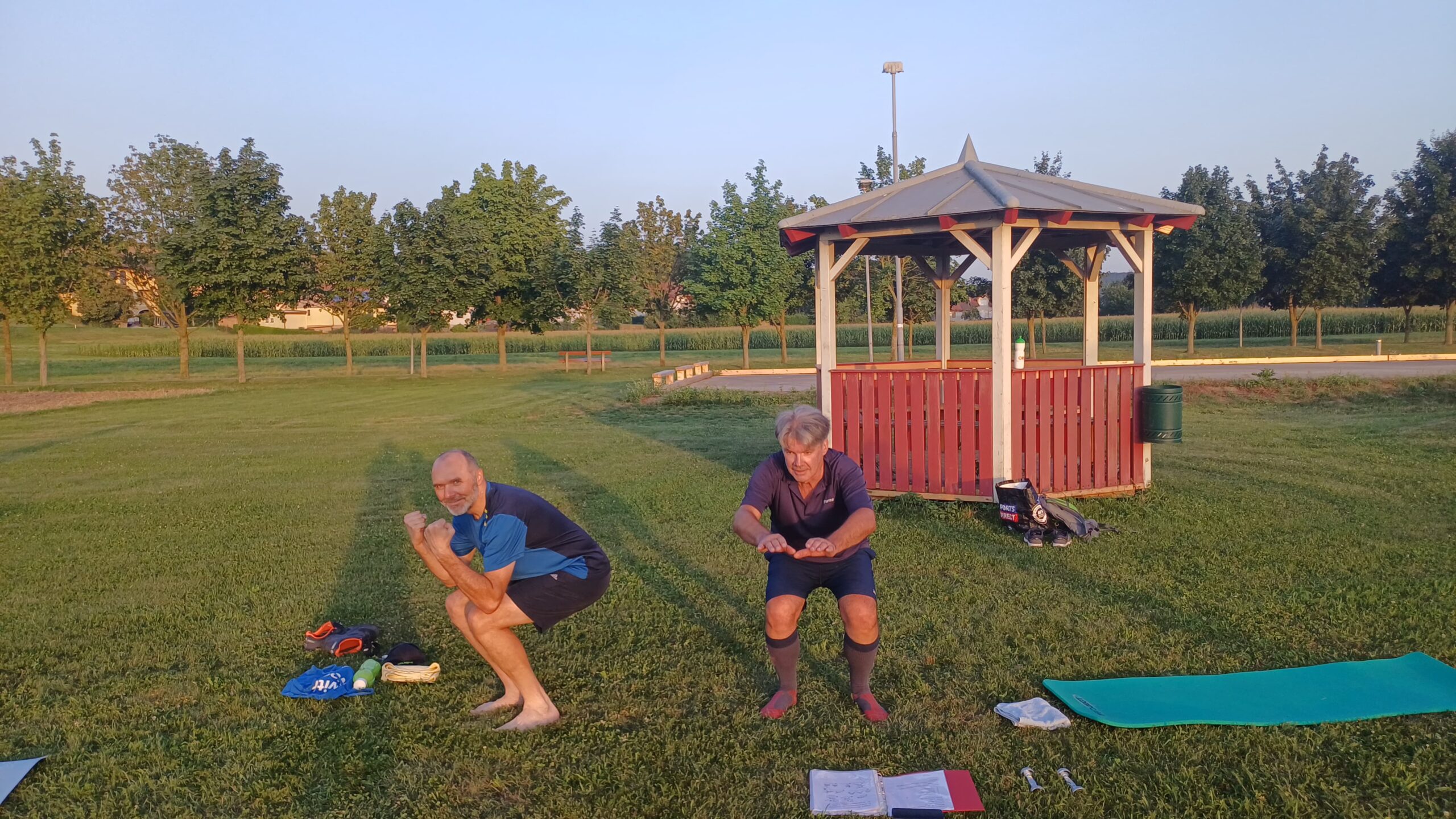 Um nicht nur „Fit durch den Winter“ zu kommen, sondern um sich auch im Sommer fit zu halten, veranstalteten Stefan Enzenhofer und Karl Picker am Donnerstag, 14. August 2025 um 19:00 Uhr eine Fitnesseinheit am Sportplatz in St. Margarethen. Vor einem malerischen Sonnenuntergang bei immer noch sehr warmen Temperaturen brachten Stefan und Karl die fleißige